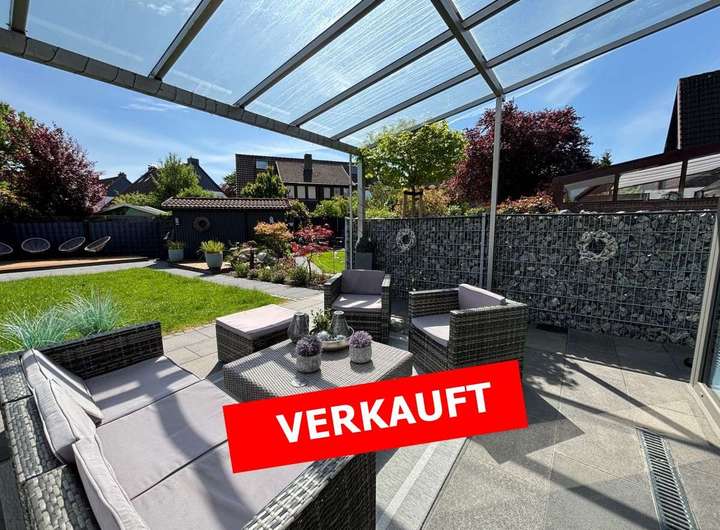 Die mittig angeordnete Doppelflügelige-Terrassentür ermöglicht einen unbeschwerten Durchgang in den wunderschönen Garten, der im hinteren Bereich noch zusätzlich mit einer Holzterrasse ausgestattet wurde.