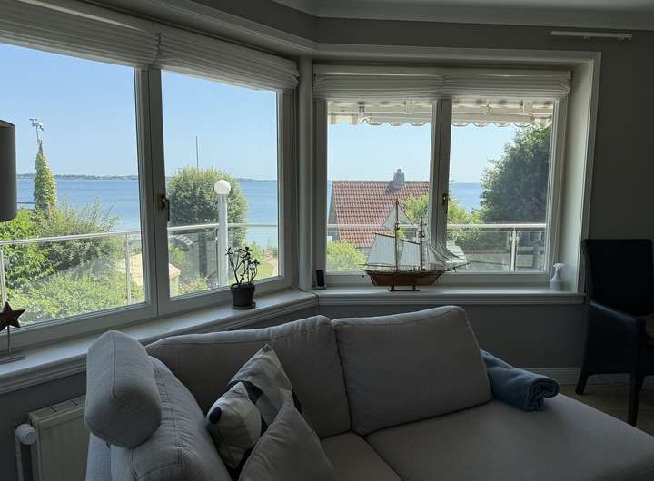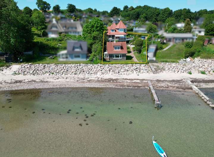 Die "Villa de Meere" bietet auf drei Ebenen und ca. 180 qm Wohn-/ Nutzfläche im Erdgeschoss einen großen Wohn-/ Essbereich mit Kachelofen und großem Balkon, im Obergeschoss einen großzügigen Schlaftrakt mit Bad und im Souterrain einen Wellness- und Ruhebereich mit Terrasse. Alle Räume sind gen Flensburger Förde ausgerichtet und bieten einen traumhaften Blick auf die Flensburger Außenförde und Dänemarks Küste.