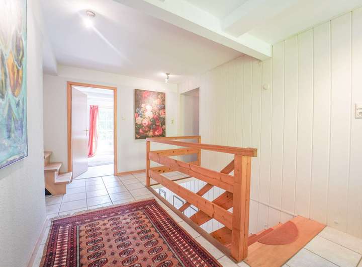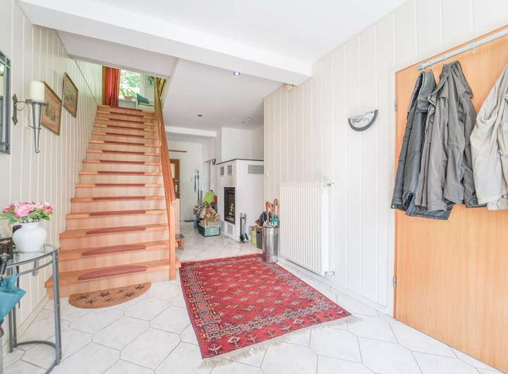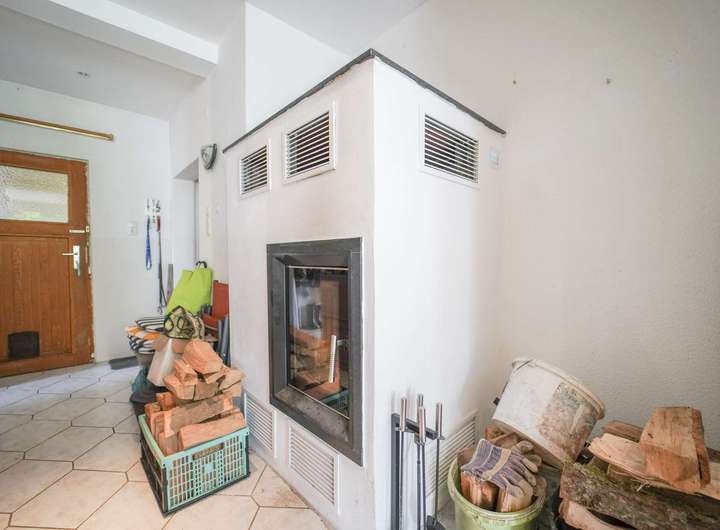 Die gehobene Innenausstattung mit geschmackvoll ausgewählten Fliesen, edlem Laminat und komfortablem Teppich schafft eine stimmige Atmosphäre, die gleichermaßen einladend wie repräsentativ wirkt. Ein eleganter Kamin unterstreicht das gehobene Wohngefühl und setzt stilvolle Akzente für entspannte Stunden mit Gästen oder Familie.