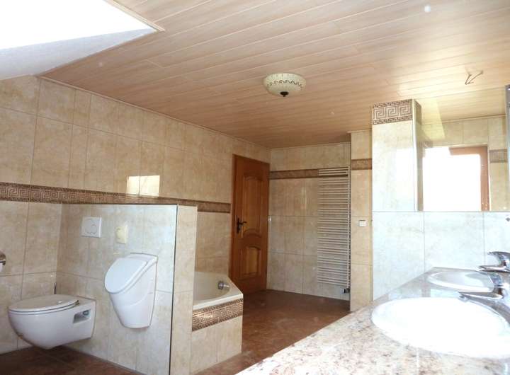 - Tageslichtbad mit Eckwanne, ebenerdiger Dusche, Einbauschrank, WC, Urinal und Doppelwaschbecken