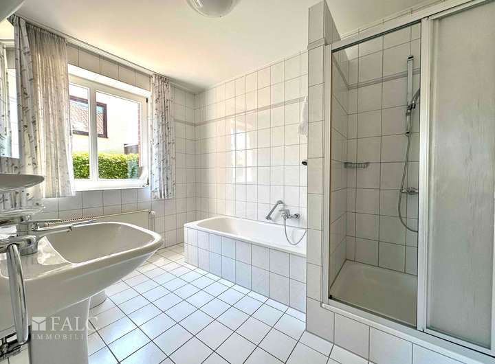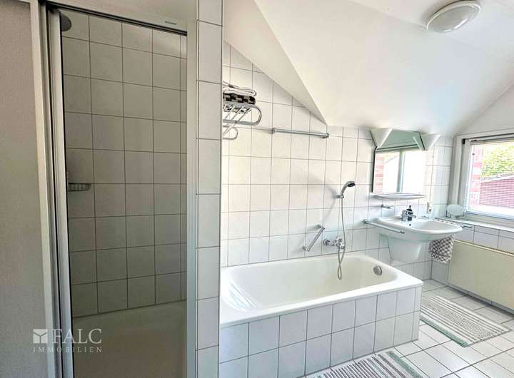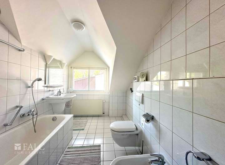 Das gepflegte Bad ist mit einer Dusche, einer Badewanne, einem Waschtisch und einem Bidet ausgestattet.