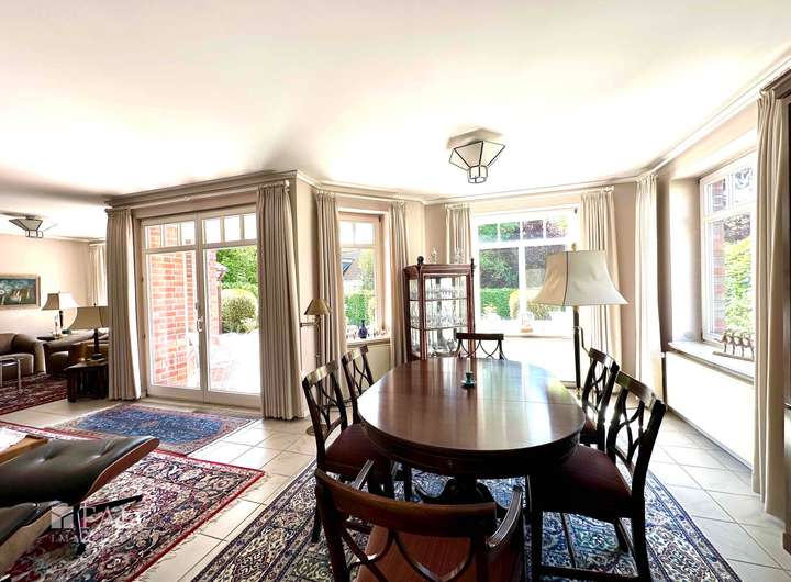 Im Erdgeschoss befindet sich ein sehr geräumiges Wohn- und Esszimmer. Die großen Fensterfronten lassen den Blick dabei ins Grüne schweifen.