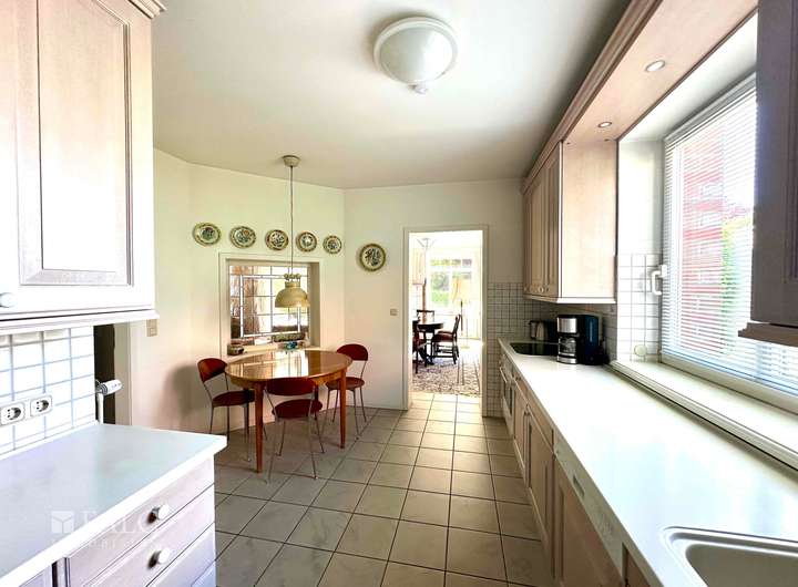 Direkt vom Wohnzimmer sowie auch vom Flur gelangen Sie in die Küche mit zeitloser Einbauküche. Diese bietet genügend Platz für eine Essgruppe. Hier können Sie wunderbar kochen und mit der ganzen Familie verweilen.