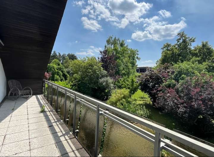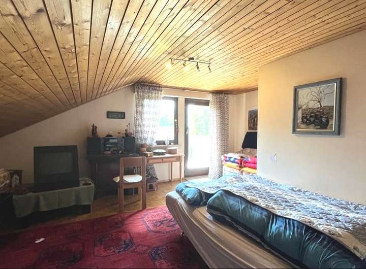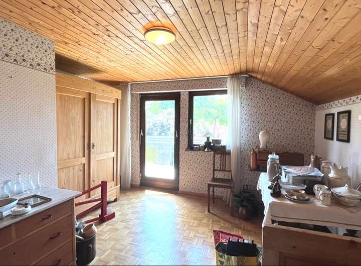 Das ca. 67 m² große Dachgeschoss hält ein weiteres Badezimmer, drei Schlafzimmer und einen Abstellraum bereit. Zwei der Schlaf- bzw. Kinderzimmer haben einen Zugang zum Süd-Balkon mit tollem Blick über die grüne Liegenschaft.
