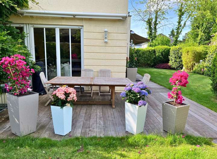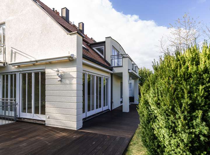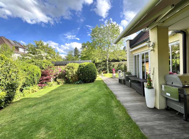 Die großzügige Terrasse in Südausrichtung bietet Platz für eine große Sitzgruppe und lädt zum geselligen Beisammensein mit Familie und Freunden ein.