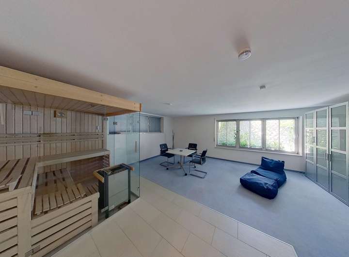 Der rund 40 m² große, wohnlich ausgebaute Kellerraum erfüllt sämtliche Ansprüche an ein zusätzliches Wohn- oder Arbeitszimmer. Er verfügt über Fußbodenheizung, hohe Decken und große Fensterflächen. Der Raum wurde bislang als Büro mit integrierter Sauna genutzt.