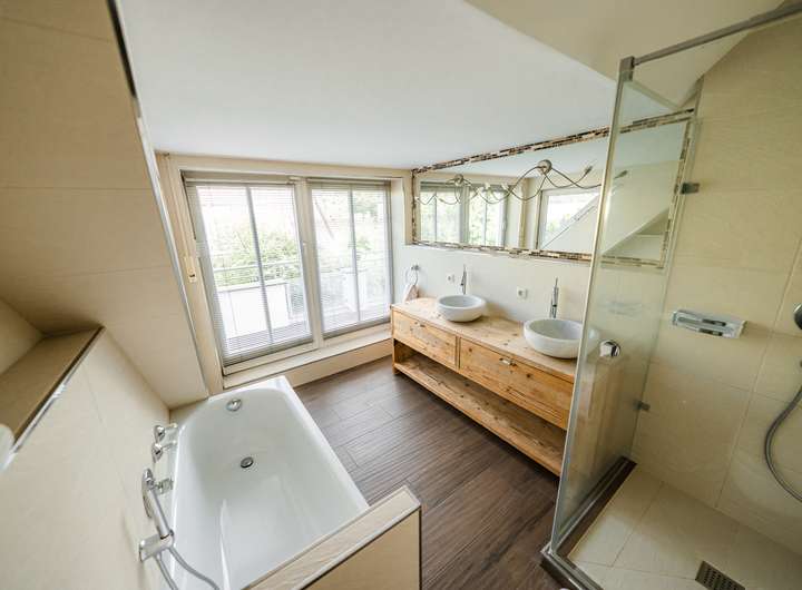 Zwei modern gestaltete Bäder sowie eine zusätzliche Dusche im Keller bieten hohen Komfort.