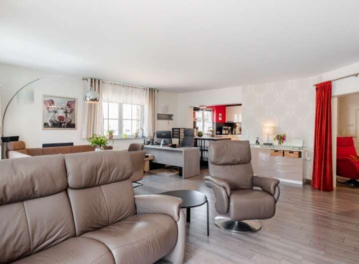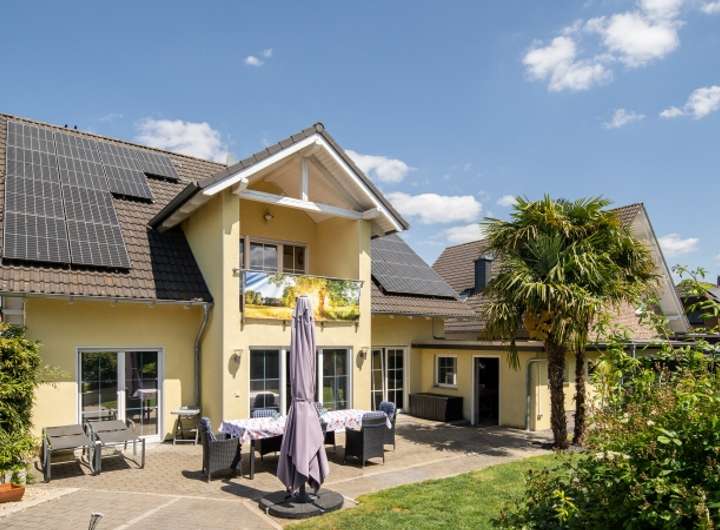 Dieses luxuriös ausgestattete Einfamilienhaus befindet sich in einer ruhigen Seitenstraße in Ortsrandlage und wurde 2004 errichtet. Auf insgesamt ca. 271m² Wohnfläche im Erd-, Ober und Kellergeschoss sowie ca. 60m² Nutzfläche verteilen sich diverse Ausstattungsmerkmale auf insgesamt drei Geschosse. Lichtdurchflutete Etagen bestechen durch eine individuelle Planung sowie eine facettenreiche Ausstattung mit hochwertigen Materialien. Der mächtige Baukörper steht auf einem ideal zugeschnittenen und exakt 1.000m² großen Grundstück.
