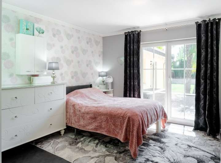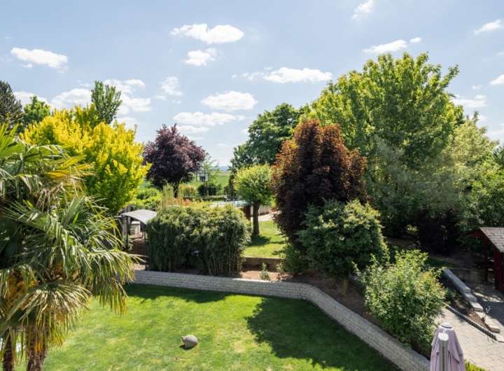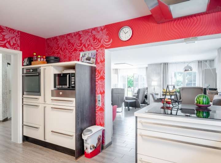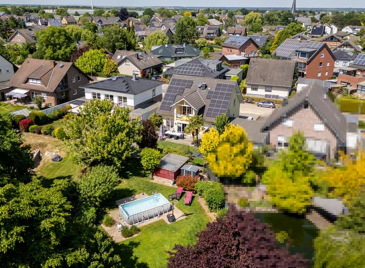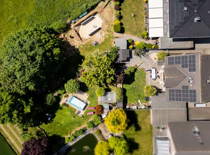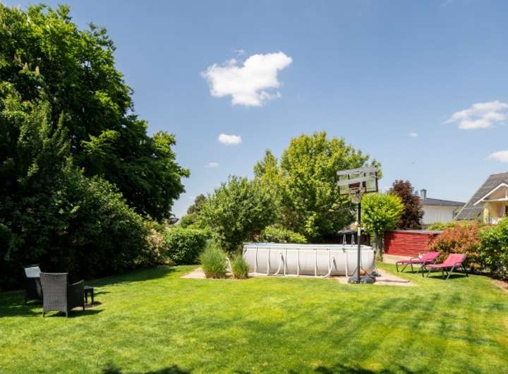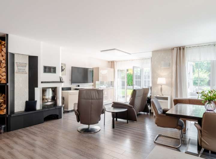 Im Erdgeschoss lädt der helle Eingangsbereich inklusive Garderobe und Gäste-WC ein. Weiter geradeaus gelangt man durch einen Flur in das Herzstück dieser Etage - das lichtdurchflutete und knapp 55m² große Wohnzimmer inklusive einzigartigen, wassergeführten Kamin und hochwertiger offener Küche samt Kochinsel aus dem Jahr 2013. Dieses bietet definitiv genügend Platz und Gestaltungsmöglichkeiten für das Familienleben und verbindet durch insgesamt fünf bodentiefe ein- oder zweiflügige Fensterelemente quasi nahtlos zur Terrasse und dem großzügigen Garten. Dieser unterteilt sich in zwei Ebenen und lässt durch seinen schönen Zuschnitt sowie seiner sonnigen Südwestausrichtung grenzenlose Gestaltungs- und Nutzungsmöglichkeiten zu. Der einladende Pool lädt zum Verweilen zu jeder Tageszeit ein. Vervollständigt wird das Erdgeschoss durch ein über 21m² großes Arbeits oder Schlafzimmer samt Ankleidezimmer sowie ein ca. 11m² großes, modernes Masterbad samt Walk-In-Dusche.