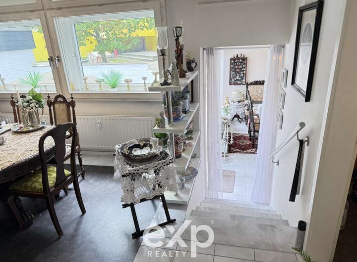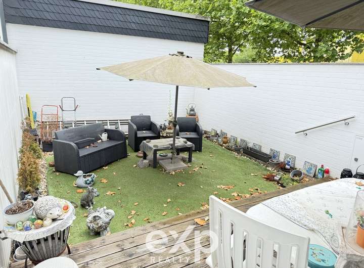 Die große weisse Hochglanz-Wohnküche ist in offener Bauweise errichtet und verbindet die Küche mit dem Wohn-/Essbereich. Eine kleine Treppe führt in das Wohnzimmer. Von dort aus gelangt man in das schöne Atrium bzw. den Hofgarten. Bodentiefe neue Fenster und Schiebetüren ermöglichen den Zugang. Durch die Fenster ist das Wohnerlebnis insgesamt hell und geprägt durch Licht.
