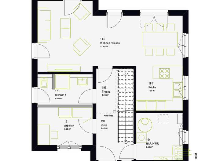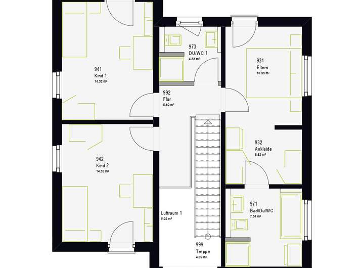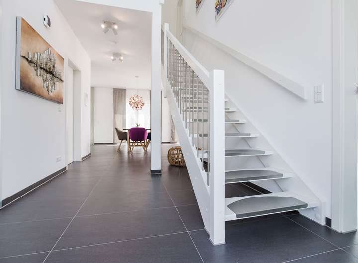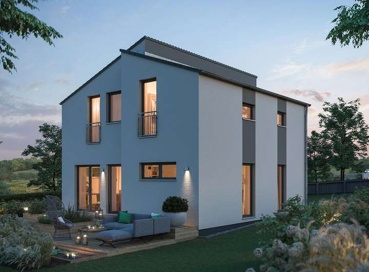 Hinweis: Die abgebildeten Innen- und Außendarstellungen sowie Sonderausstattungen dienen lediglich der Veranschaulichung und können von der tatsächlichen Ausführung abweichen. Der angegebene Preis versteht sich exklusive der in den Beispielbildern gezeigten Sonderausstattungen. Die Konfiguration Ihres Traumhauses erfolgt individuell und kann an Ihr Budget und Ihre Wünsche angepasst werden.