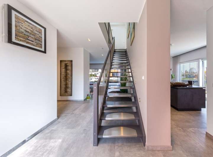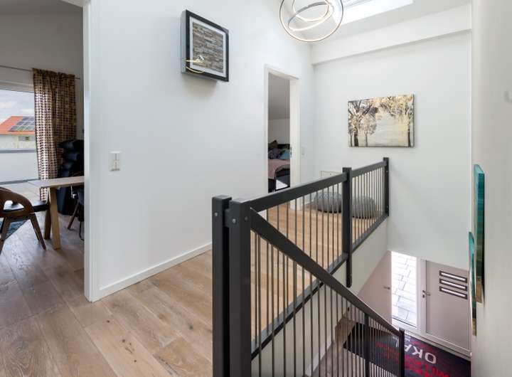 die mittig gelegene Treppe geht es ins Obergeschoss. Hier ist