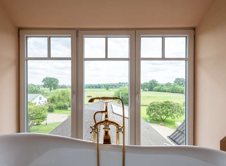 _Exklusives Badezimmer mit begehbarer Dusche und freistehender Badewanne und Blick auf die Weide