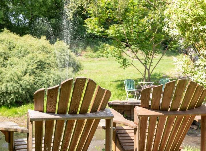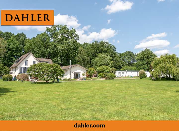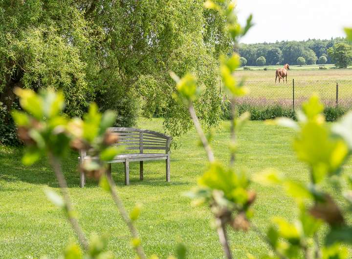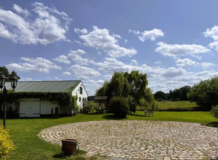 Zur Außenanlage gehören ein romantischer Naturteich, ein historischer Baumbestand mit Exemplaren, die über 300 Jahre alt sind, sowie ein separater Hundeauslaufbereich. Die elektrisch gesteuerte Toreinfahrt, zwei Rasenroboter und ein eigenes Brunnenwasser-System sorgen für Komfort und Autarkie. Die neu eingedeckten Dächer der Nebengebäude sind zudem mit einer Photovoltaikanlage ausgestattet – ein weiterer nachhaltiger Pluspunkt dieser Liegenschaft. Historisches Feldsteinpflaster rundet das Gesamtbild stilvoll ab.
