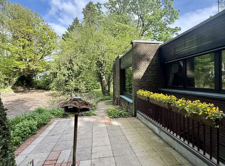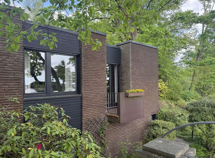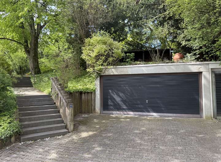 In den Außenanlagen liegt die Südterrasse mit Rheinblick unter alten Bäumen. Die Südterrasse wird über das Wohnzimmer erreicht und verfügt über einen Außenkamin. Die geschützte Nordterrasse am Weiher erreicht man über das Esszimmer.