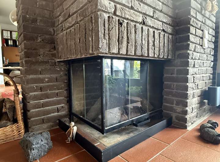 Großzügiger Wohn- und Essbereich mit Kamin und großen Fensterfronten