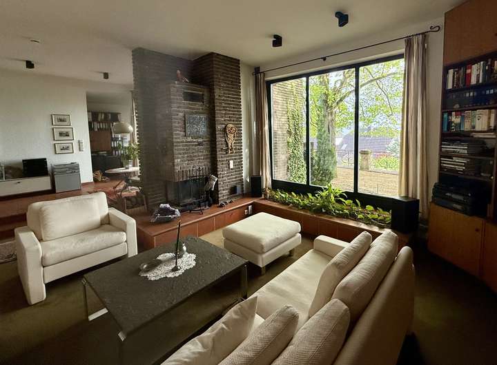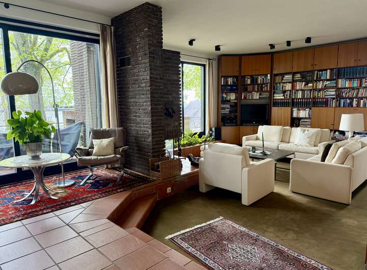 Die Hauptwohnung verfügt über getrennte Wohn- und Schlafbereiche. Der großzügige Wohn- und Essbereich ist mit einem Kamin und großen Fensterfronten ausgestattet. Weitere Räumlichkeiten sind eine Küche, ein Arbeitszimmer und eine Gästetoilette.