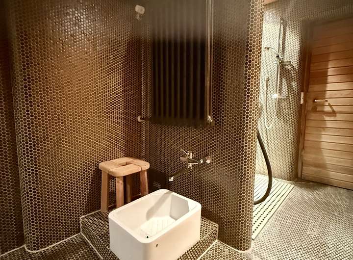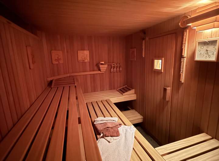 Der Wellnessbereich im Untergeschoss verfügt über eine Sauna, Duschen, ein Tauchbecken und eine Toilette mit Waschbecken. Hierzu zählt auch ein großer Ruheraum, der auch als Gäste- oder Sportzimmer genutzt werden kann. An den Saunabereich schließt sich eine geschützte und nicht einsehbare Außenterrasse an.