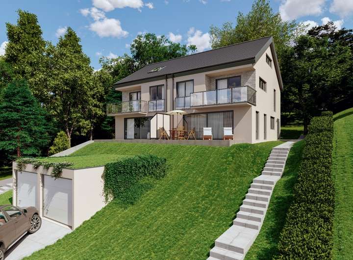 Ihr Haus wird individuell nach Ihren Vorstellungen und Wünschen realisiert. Bei der Grundrissgestaltung und der Ausstattung können Sie also komplett mitwirken. Bei einer Hausbreite von ca. 7,25 m und einer geschickten Anordnung der Terrassen erhalten beide Häuser den Charakter eines Einfamilienhauses mit ca. 160 m² Wohnfläche. Aufgrund der optimalen Ausrichtung nach Südwesten grüßt von morgens bis abends die Sonne. Aus dem Wohnzimmer genießen Sie den herrlichen und weitläufigen Blick ins Grüne und auf die Wälder. Alle Räume werden mit viel natürlichem Licht durchflutet, bieten eine herrliche Aussicht und sind großzügig konzipiert.