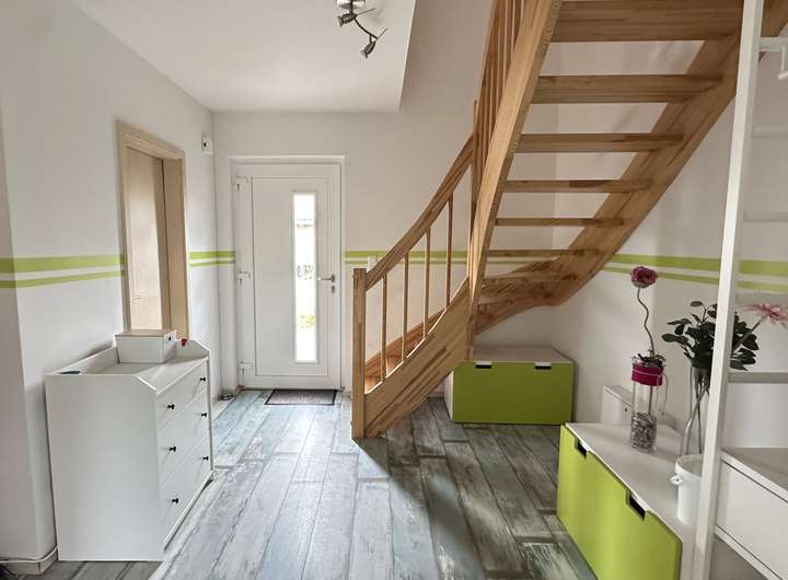 Das Holzrahmenhaus bietet mit rd. 110 m² Wohnfläche ausreichend Platz für die Familie. Mit insgesamt vier hellen und freundlichen Zimmern haben Sie viel Spielraum, um individuelle Rückzugsorte zu schaffen. Ob als Kinderzimmer, Arbeitsraum oder Gästezimmer – hier ist alles möglich! Besondere Akzente setzen die großen Fenster, die nicht nur für viel Licht sorgen, sondern auch einen wunderbaren Blick in den Garten ermöglichen.