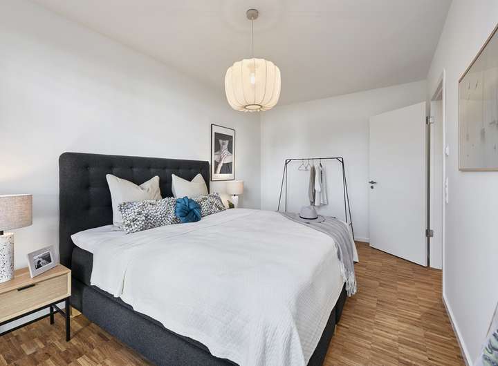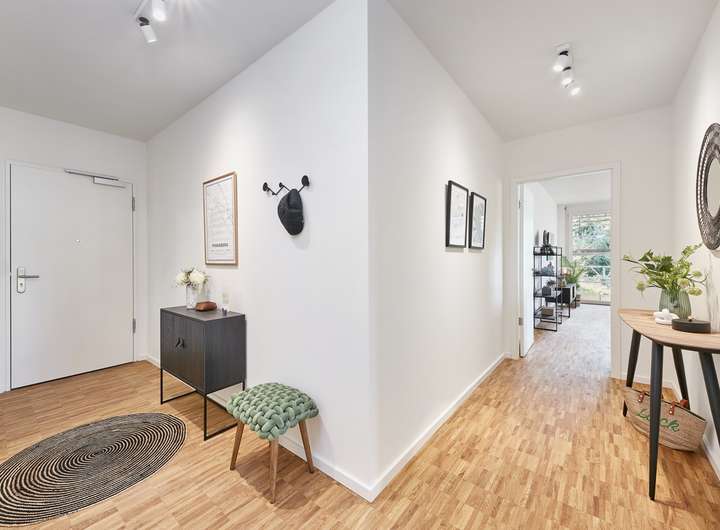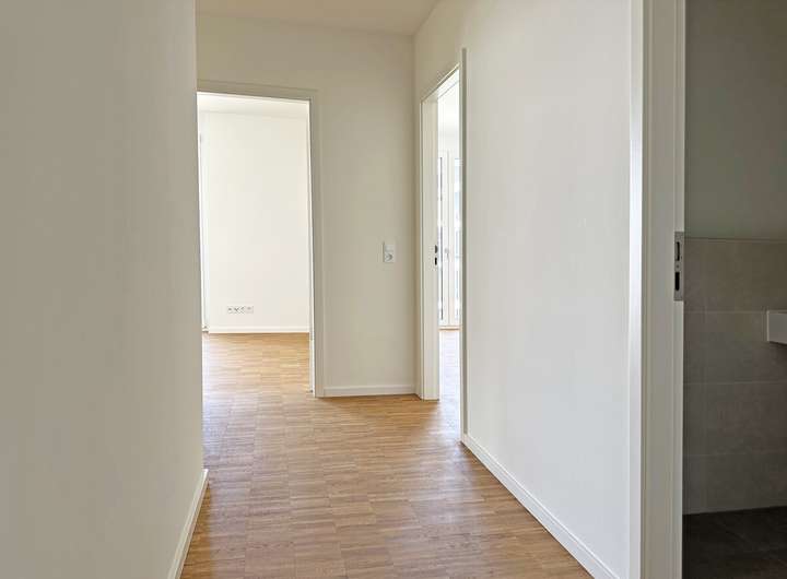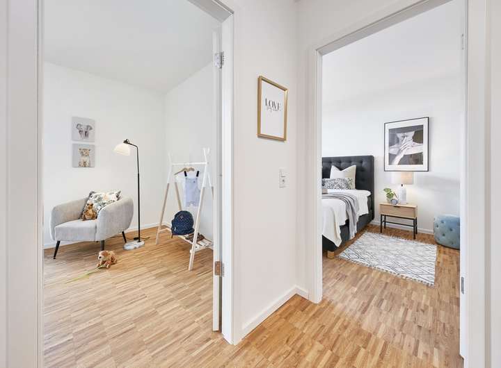 Die beiden Schlafzimmer liegen ruhig im hinteren Teil der Wohnung und bieten genau den Rückzugsort, den man sich wünscht. Das Hauptschlafzimmer überzeugt mit Großzügigkeit, das zweite Zimmer eignet sich perfekt als Büro, Kinderzimmer oder Gästezimmer. Der lange, einladende Flur schafft eine klare Struktur und verbindet alle Räume zu einem harmonischen Gesamtbild. Ein modernes Bad mit bodengleicher Dusche sowie ein kompakter Abstellraum runden die praktische Wohnfunktion ab.
