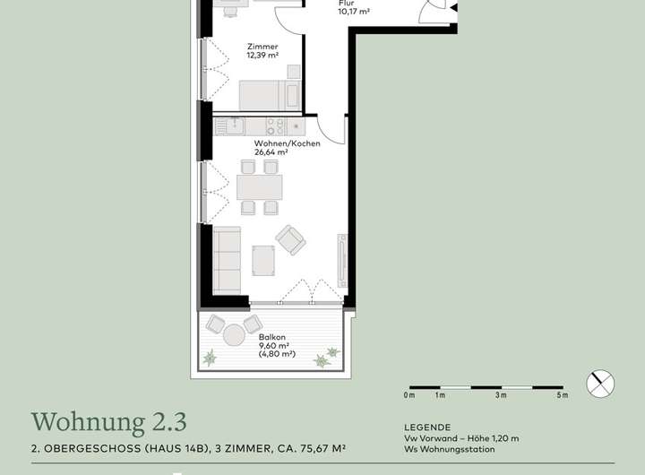 Diese sofort bezugsfertige 3-Zimmer-Wohnung im 2. Obergeschoss bietet ein modernes Zuhause mit viel Licht, Klarheit und einer warmen Wohnatmosphäre. Mit ca. 75 m² ist sie ideal für Singles, Paare oder kleine Familien, die Wert auf Qualität, Komfort und eine naturnahe Umgebung legen. Der offene Wohn- und Kochbereich mit über 26 m² bildet das Herzstück der Wohnung und öffnet sich direkt zum sonnigen Süd-Balkon – ein wunderbarer Platz für ruhige Stunden oder gesellige Momente im Freien.