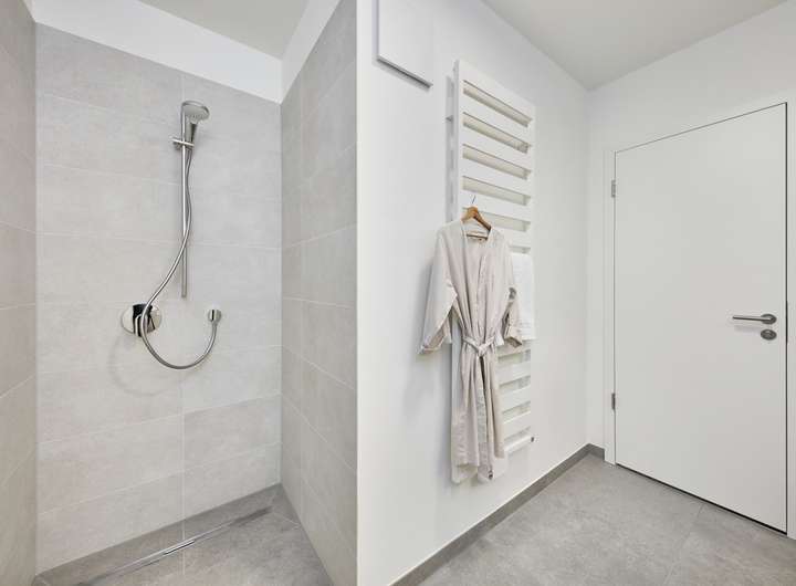 Die Ausstattung ist – typisch für ROCKSTONE – hochwertig und bewusst ausgewählt. Echtes Eichenparkett, elegante großformatige Fliesen, moderne Sanitärobjekte und ein Handtuchheizkörper sorgen für ein stilvolles Wohngefühl. Die Fußbodenheizung verteilt angenehme Wärme im gesamten Wohnraum. Bodentiefe Fenster lassen viel Tageslicht hinein und schaffen eine klare, freundliche Atmosphäre, die den Charakter dieser Wohnung prägt.