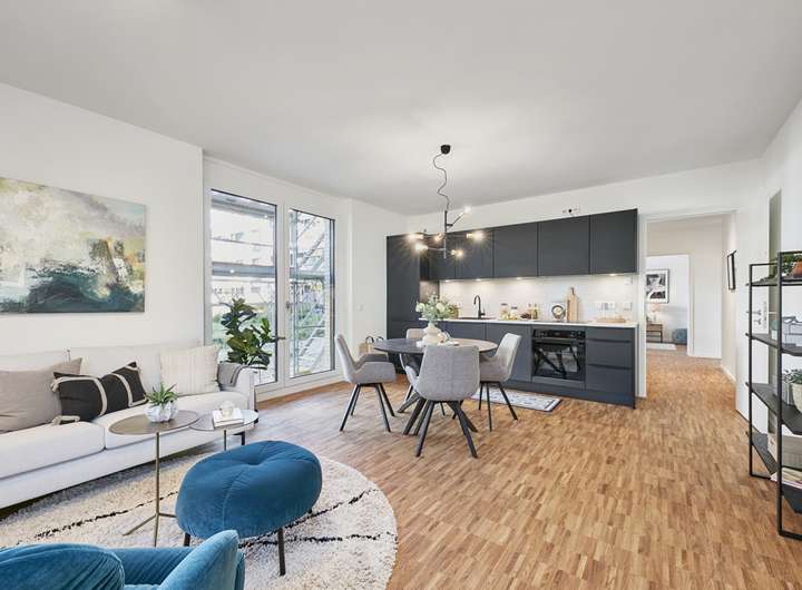 Die großzügig geschnittenen 2- bis 5-Zimmer-Wohnungen sind bezugsbereit und bieten bodentiefe, 3-fach verglaste Fenster mit Blick ins Grüne, kombiniert mit einem urbanen Umfeld. Ob Balkon, Terrasse oder Loggia – jede Wohnung eröffnet Raum zur Entfaltung und zum Wohlfühlen.