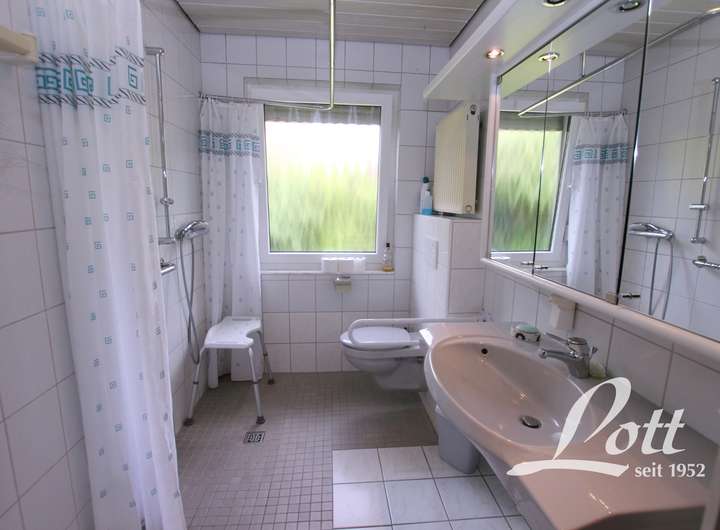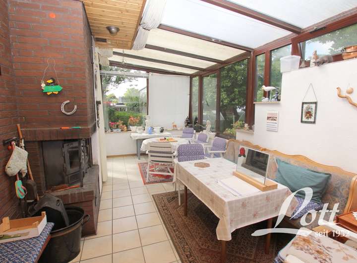 Eingangsdiele, großzügiges Wohnzimmer, Esszimmer mit Zugang zum Wintergarten, Küche, Schlafzimmer, Duschbad (barriererfrei) und Flurbereich