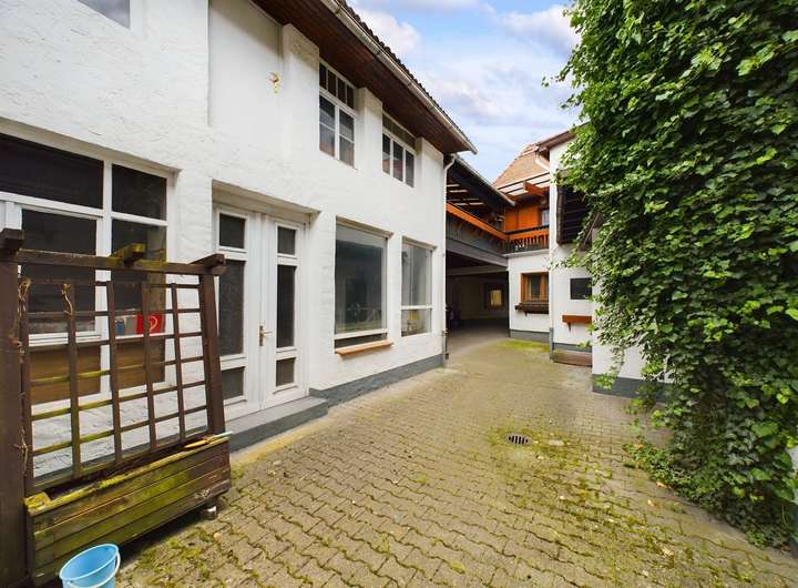Dieses charmante Wohn-Geschäftshaus mit Werkstatt liegt in zentraler Altstadtlage von Usingen. Die Immobilie verfügt über eine Gesamtwohnfläche von ca. 240 m², verteilt auf zwei Wohneinheiten, die miteinander verbunden sind (bisher keine zwei separaten Zugänge, aber die Möglichkeit besteht). Diese einzigartige Immobilie bietet Ihnen nicht nur zwei miteinander verbundene Wohnungen, sondern auch eine geräumige Werkstatt und Lagerräume. Beim Betreten des Eingangsbereichs werden Sie von einem einladenden Flur empfangen, der Sie zur rechten Seite in die großzügige Wohnküche führt. Diese ist mit einer etwas in die Jahre gekommenen Einbauküche ausgestattet. Angrenzend an die Küche befindet sich das gemütliche Esszimmer. Der Flur führt Sie weiter zu einem geräumigen Wohnbereich, der ebenfalls direkt von der Küche erreichbar ist. Das Wohnzimmer ist schön hell und gut zu gestalten. Zur Linken des Flurs befindet sich ein Duschbad mit Tageslicht und ein WC. Auf derselben Ebene finden Sie einen vielseitiger Hobby- oder Partyraum mit Bartheke, perfekt für gesellige Zusammenkünfte oder entspannte Stunden allein. Im Obergeschoss erwartet Sie die zweite Wohneinheit mit 5 Zimmern. Ein heller Wohnraum lädt zum Verweilen ein, während die Wohnküche mit einer charmanten älteren Einbauküche ausgestattet ist. Das angrenzende Esszimmer bietet eine gemütliche Atmosphäre für gemeinsame Mahlzeiten. Der Flur führt Sie zu einem geräumigen Schlafzimmer und zwei Kinderzimmern, die nur darauf warten, nach Ihren individuellen Vorstellungen gestaltet zu werden. Des Weiteren gibt es ein Wannenbad mit Tageslicht und ein separates WC. Über den Außenbereich gelangen Sie in die großzügig geschnittene Werkstatt und in die Lager-Räumlichkeiten, die Ihnen vielfältige Nutzungsmöglichkeiten bieten. Diese Immobilie bietet Ihnen ein einzigartiges Wohn- und Arbeitskonzept, das Raum für Kreativität und persönliche Entfaltung lässt. Der große Innenhof wartet auf eine liebevolle Gestaltung.