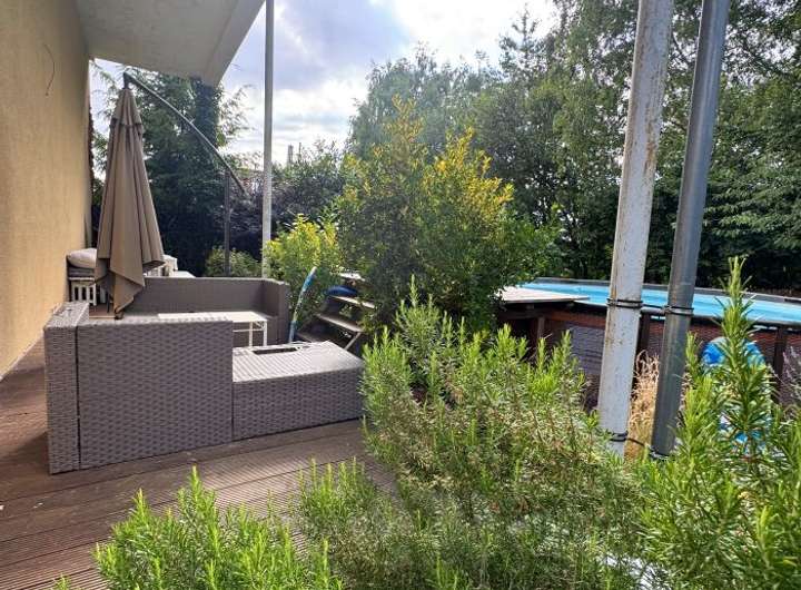 In the yard is a large terrace and a outdoor pool.
