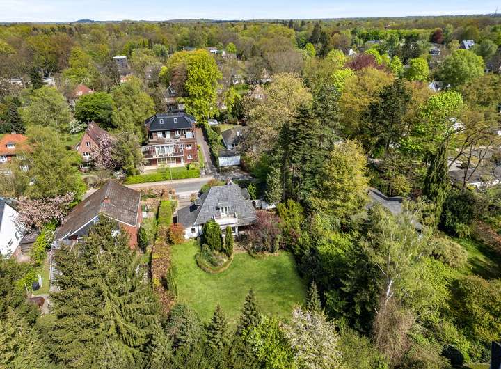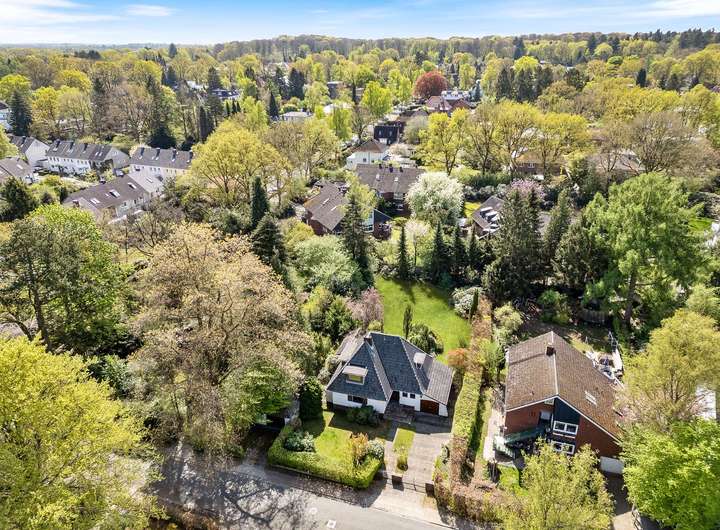 In einer der charmantesten Wohnstraßen von Hamburg-Volksdorf gelegen, bietet dieses Grundstück eine seltene Kombination aus Ruhe, Naturnähe und gewachsener Nachbarschaft. Die Umgebung ist geprägt von gepflegten Einfamilienhäusern, stilvollen Stadtvillen und Doppelhäusern mit großzügigen Gärten – ein Quartier, das sich durch seine homogene Bebauung, breiten Grünstreifen und alten Baumbestand auszeichnet.