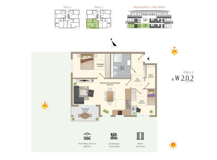 Die Wohnung W 2.0.2 ist eine 3-Zimmer-Wohnung mit ca. 77,75 m² Wohnfläche im Erdgeschoss. Zur Wohnung gehört eine Terrasse mit ca. 6,16 m² (Nutzfläche) mit vorgelagertem Gartenanteil von ca.152 m² und ein Tiefgaragen-Stellplatz. Die Terrasse ist nach Süd-West ausgerichtet. Die Ausführung ist barrierefrei!