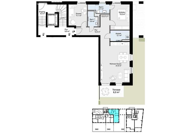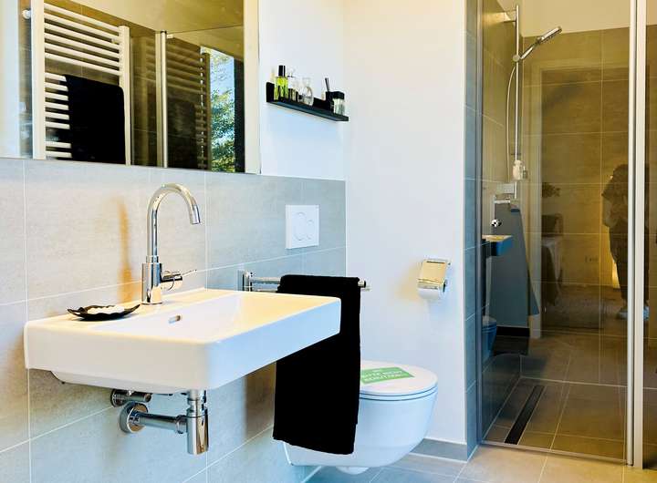 einladende Atmosphäre. Alle Wohnungen verfügen über eine Fußbodenheizung, die für wohlige Wärme sorgt. Teilweise verfügen die Wohnungen über einen Abstellraum sowie zusätzlich über ein Ankleidezimmer. Der jeweils kombinierte Ess- und Wohnbereich ist sehr gelungen gestaltet und bis zu 50 m² groß. Die Bäder bieten formschöne Sanitärobjekte von Markenherstellern (z. B. Villeroy & Boch, Grohe) und Handtuchwärmer. Hier kann man sich vom Alltagsstress entspannen und es sich einfach gut gehen lassen.