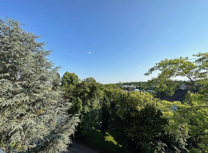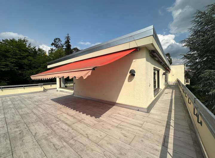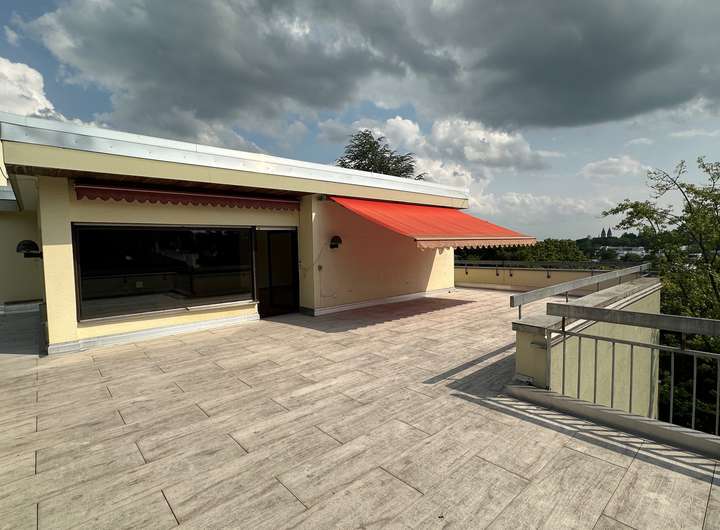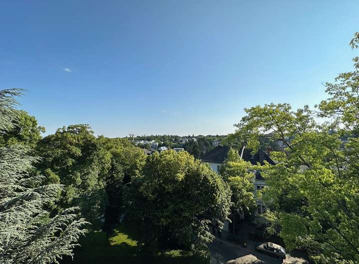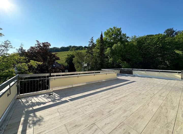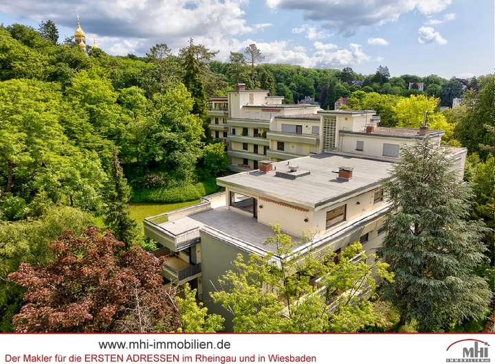 Die exklusive, große Penthouse Wohnung vefügt über eine riesige - ca. 120 m² große - Sonnenterrasse und bietet einen fantastischen Aus- und Rundumblick auf den Wiesbadener Neroberg, die griechische Kapelle und das Nerotal.
