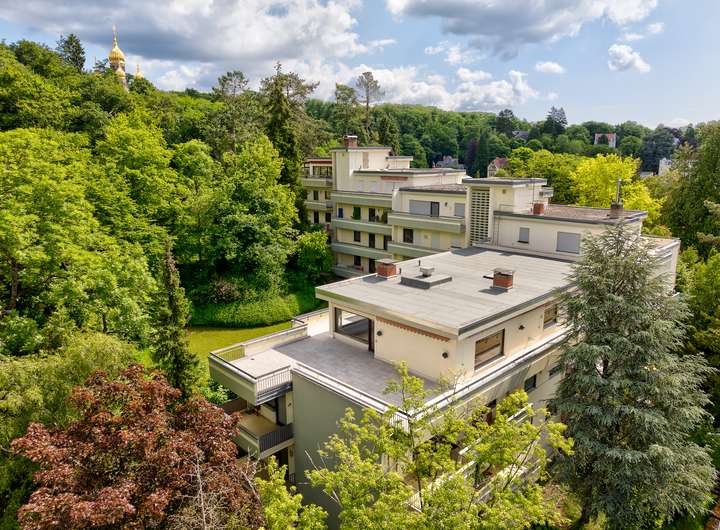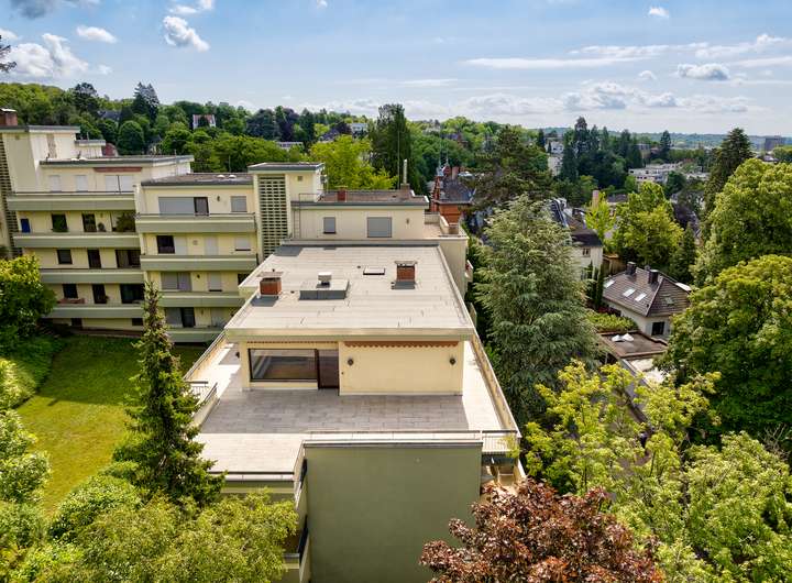 Es handelt sich bei diesem attraktiven Immobilienangebot unseres Hauses um eine exklsuive Penthouse Wohnung, die sich in einem Mehrparteienhaus – einer Wohnanlage, die aus 25 Wohnungen besteht – befindet. Das Penthouse befindet sich in Wiesbadener Bestlage, dem Nerotal. Die Penthouse Wohnung, die barrierefrei über einen Lift/Auszug erreichbar ist, der direkt zum Penthouse führt, verfügt über 4 Zimmer, Küche, 2 Bäder (Wannen- und Duschbad), einen Abstellraum und eine riesige, ca. 120 m² große Sonnenterrasse, die einen traumhaften Ausblick auf den Wiesbadener Neroberg, die griechische Kapelle und das Nerotal bietet. Ein Tiefgaragenstellplatz und ein Kellerraum gehören zum Angebot. In der Wohnanlage stehen des Weiteren eine Sauna, ein Fahrradabstellplatz sowie ein Wasch- und Trockenraum zur Verfügung. Die Penthouse Wohnung präsentiert sich in einem gepflegten Objektzustand. Das monatliche Wohngeld beträgt derzeit € 1.065,-- und umschließt alle aktuell anfallenden Nebenkosten der Penthouse Wohnung einschließlich der Verwaltung und auch einer angemessenen Rücklagenbildung für Reparaturen. Ob zum Selbstbezug oder als Kapitalanlage – beide Varianten stellen in dieser Spitzenlage eine lohnende Investition dar.