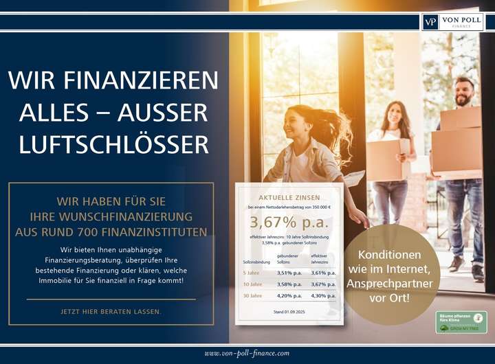 Bei dem Angebot handelt es sich um ein unbebautes Grundstück mit vorliegender Baugenehmigung. Zur Veranschaulichung möglicher Bebauungsoptionen dienen Visualisierungen und Planungsunterlagen eines externen Hausherstellers. Diese stellen keine rechtsverbindliche Bauverpflichtung oder Bauzusage dar. Ein Erwerber ist nicht verpflichtet, mit dem vorgeschlagenen Bauunternehmen zu bauen. Sollte sich ein Käufer nach Erwerb des Grundstücks freiwillig für eine Zusammenarbeit mit der Firma Regnauer entscheiden, erfolgt dies ausschließlich auf Grundlage eines gesondert abzuschließenden Werkvertrags zwischen Erwerber und Bauunternehmen. Die von Poll Immobilien GmbH ist an diesem Vertrag nicht beteiligt und übernimmt hierfür keine Haftung.