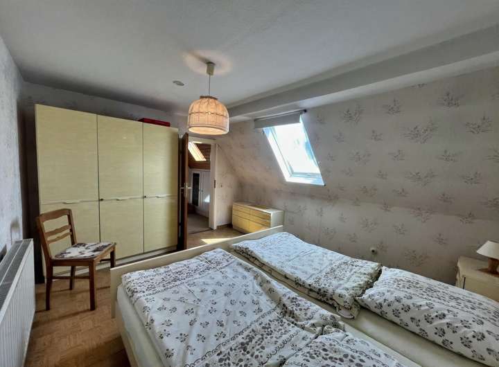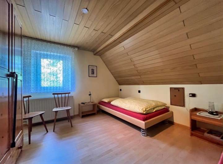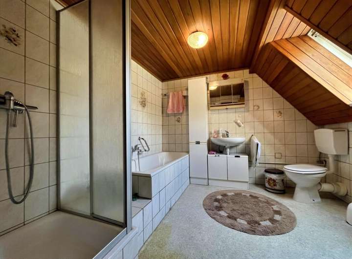 Das Obergeschoss bietet 3 Zimmern und dem Badezimmer mit Dusche, Badewanne und WC Platz.