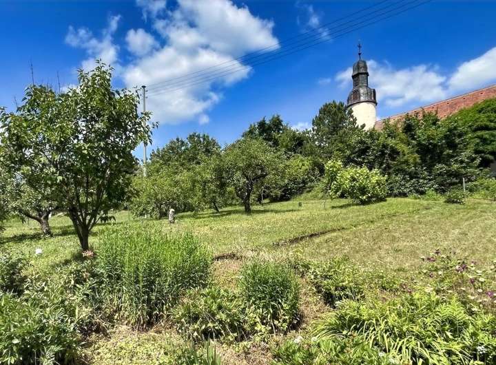 Hinter dem Haus erstreckt sich der sonnige Garten mit seinen Obstbäumen. Dieser bietet Ihnen viel Platz zur freien Entfaltung und lädt zum Spielen, Gärtnern, usw. direkt unterhalb der Dorfkirche ein.