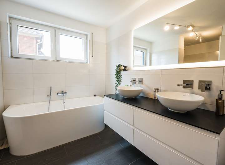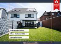 Im Obergeschoss befinden sich zwei geräumige Schlafzimmer sowie ein hochwertig ausgestattetes Tageslichtbad mit Dusche und Badewanne. Das ausgebaute Dachgeschoss bietet ein ideales Arbeitszimmer mit angrenzendem Tageslichtbad inklusive Dusche, ein weiteres Zimmer, das aktuell als Gästezimmer genutzt wird, sowie einen Hauswirtschaftsraum mit der Heizungsanlage und Anschlüssen für Waschmaschine und Trockner.