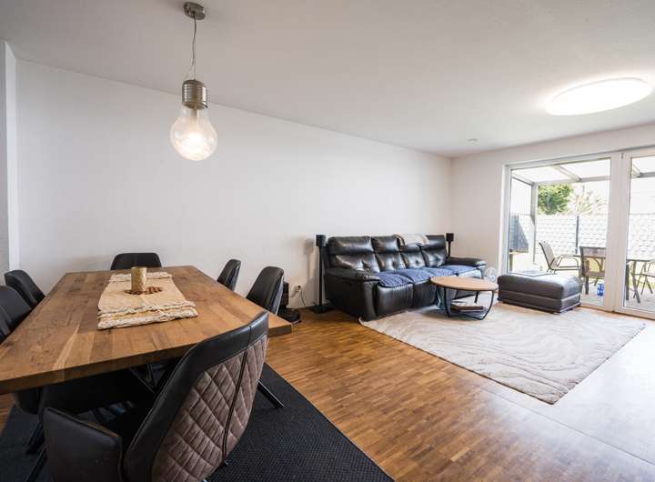 Im Erdgeschoss empfängt Sie ein heller, offener Wohn- und Essbereich mit moderner Einbauküche, der durch große Fensterflächen und den direkten Zugang zur überdachten Terrasse sowie dem angrenzenden Garten überzeugt. Ein Gäste-WC mit Fenster sowie ein praktischer Abstellraum runden das Raumangebot auf dieser Ebene ab.