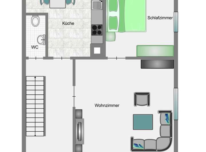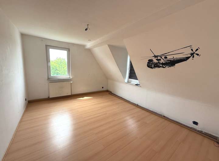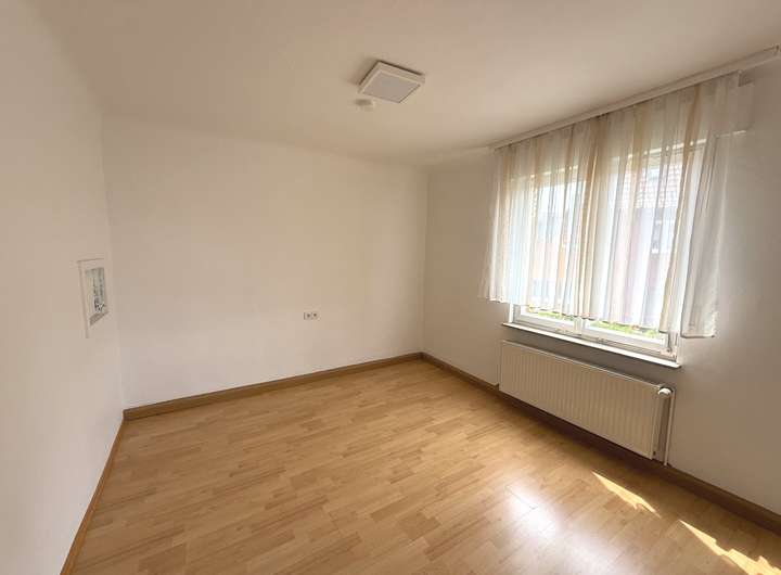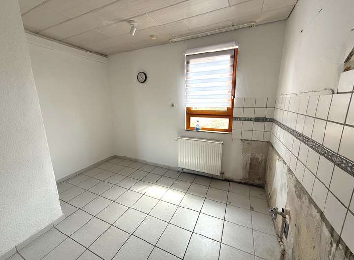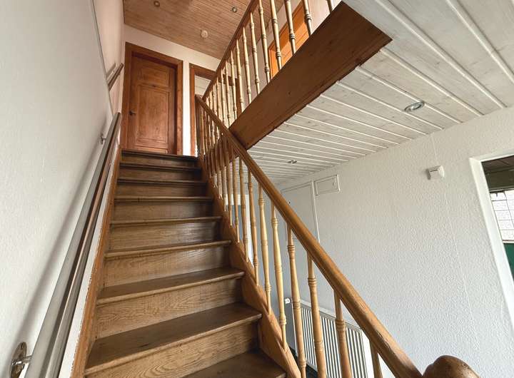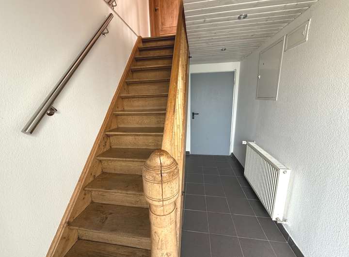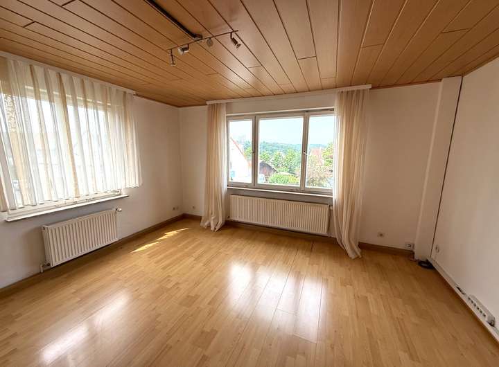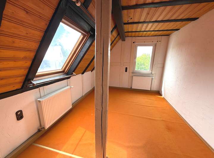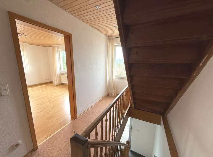 Im Obergeschoss befindet sich das Wohnzimmer mit schönem Ausblick, ein Schlafzimmer, die Küche ohne Einbauküche und ein separates WC.
