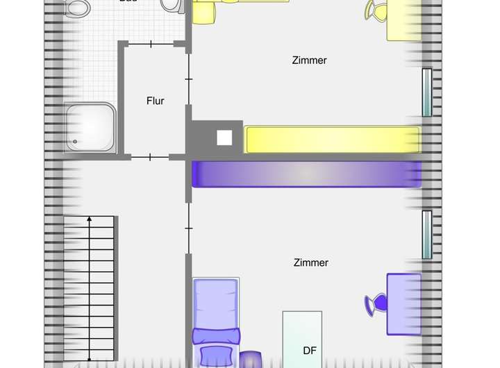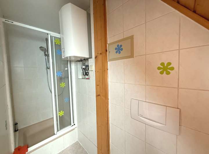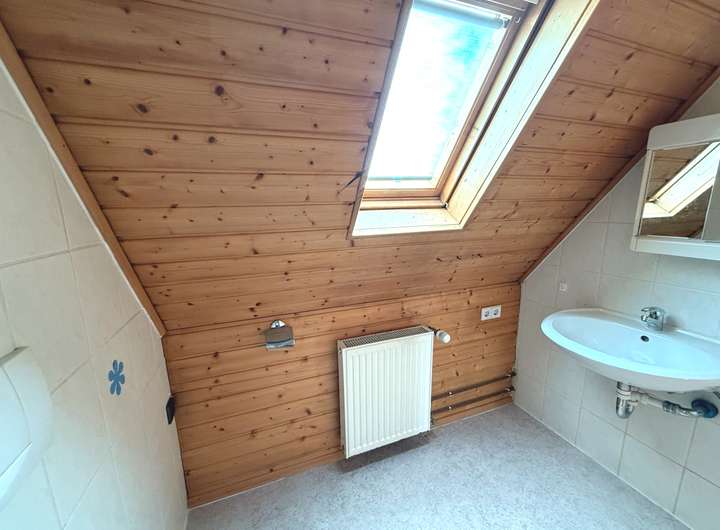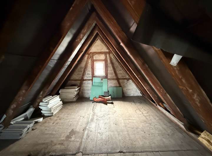 Im Dachgeschoss befinden sich zwei Schlafzimmer, sowie ein kleines Badezimmer mir Dusche, WC und Waschbecken. Der Dachboden des Hauses kann als Bühnenraum genutzt werden.