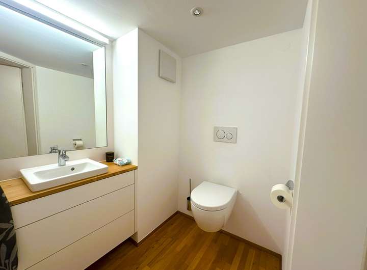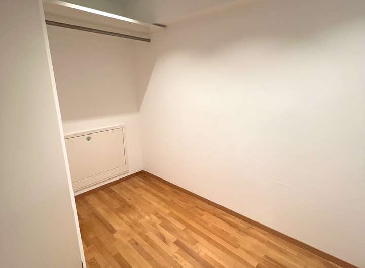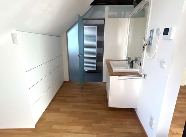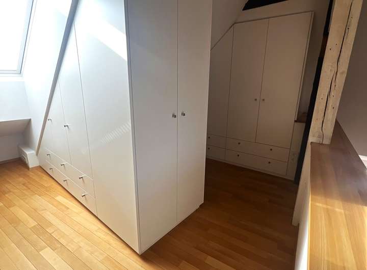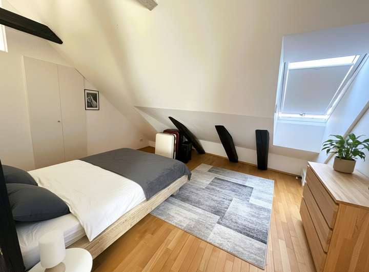 Im oberen Geschoss befindet sich ein offener Schlafbereich mit angrenzendem Ankleidebereich und direktem Zugang zum Badezimmer – ein ruhiger Rückzugsort, der den Maisonette-Stil ideal ergänzt. Ein zusätzliches Gäste-WC, hochwertige Parkettböden und maßgefertigte Einbauten runden das stimmige Gesamtbild ab.
