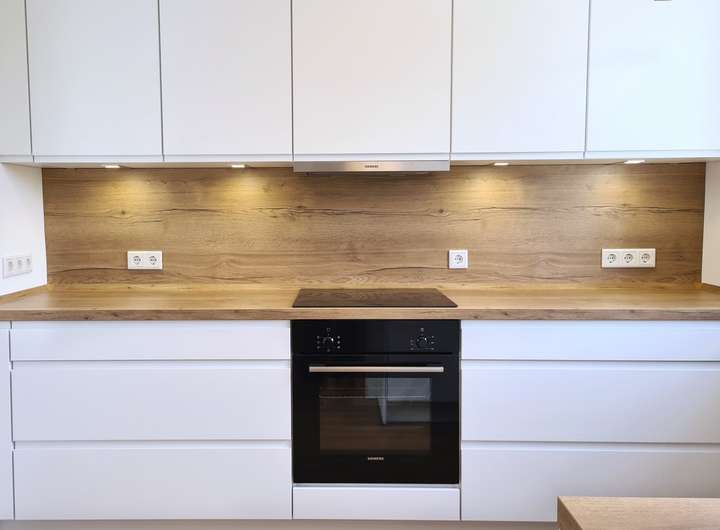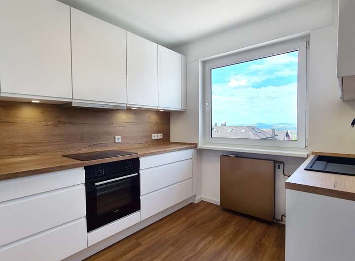 - Moderne Einbauküche (neu) im eleganten Stil mit Blick in die malerische Umgebung