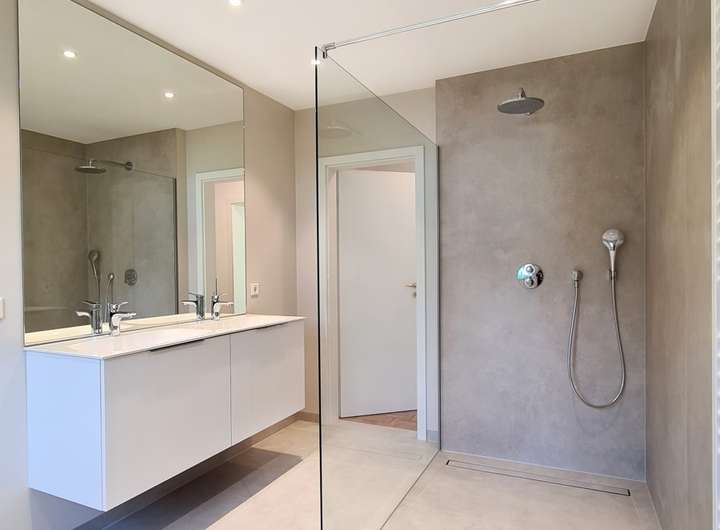 Das Schlafzimmer verfügt ebenfalls über einen Zugang zur Terrasse. Das Hauptbad ist mit einer großen modernen Dusche mit Glaswand ausgestattet, welche ebenerdig angelegt ist. Ein großer Spiegel und ein Doppelwaschtisch komplettieren die Ausstattung und transportieren eine gehobene Atmosphäre. Ihre brandneue Küche verbindet Funktionalität mit einem wertigen Erscheinungsbild. Blicken Sie hier in die malerische Umgebung!