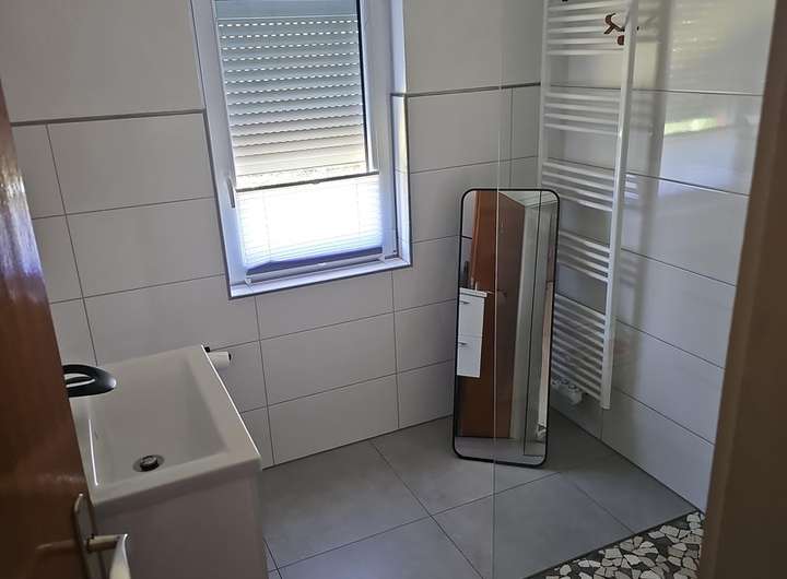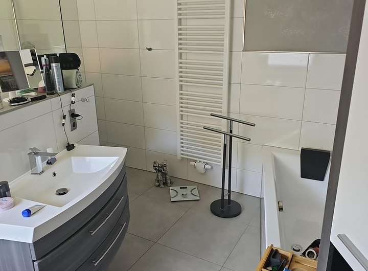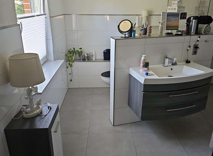 Alle Badezimmer sind ebenfalls modern, hell und funktional. Die Räume sind mit großformatigen, hellen Fliesen an Wänden und Boden versehen, was für eine pflegeleichte und hygienische Oberfläche sorgt und den Raum optisch vergrößert. Die Wandfliesen im Duschbereich reichen teilweise bis zur Decke. Zudem ist eine elegante Badewanne vorhanden.