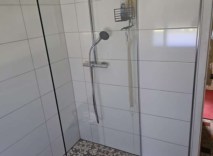 Ebenerdige, offene Duschen mit einer Glasabtrennung im unteren Bereich, bietet hohen Komfort und ist barrierearm gestaltet. An eines der moden Badezimmer schließt direkt ein Schlafzimmer.