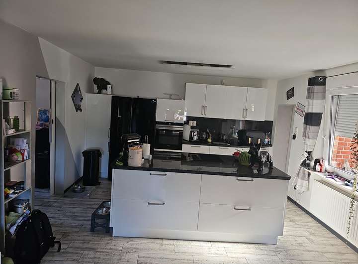 Die Küche besticht durch ein zeitgemäßes Design mit weißen Hochglanzfronten bei allen Unter- und Oberschränken. Die dunklen Arbeitsplatten bilden einen eleganten Kontrast dazu. Eine großzügige Kücheninsel mit integrierten Schubladen dient nicht nur als zusätzliche Arbeitsfläche und Stauraum, sondern auch als zentraler Treffpunkt. Die Küche ist mit modernen Elektrogeräten ausgestattet, darunter ein großer, freistehender Kühlschrank in dunklem Design und ein integrierter Backofen auf Arbeitshöhe.
