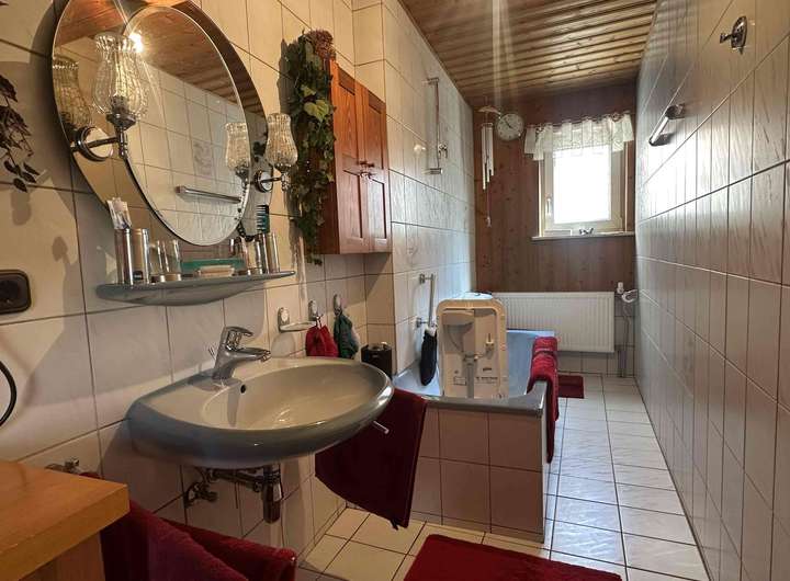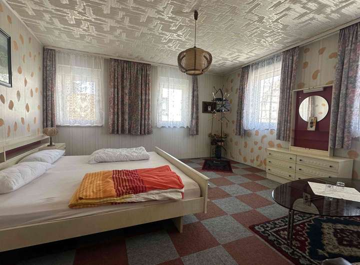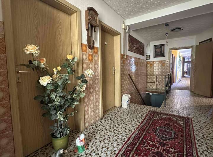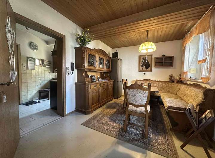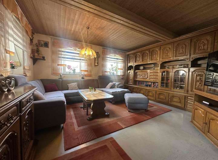 Der Wohnbereich des Hauses ist gemütlich und traditionell eingerichtet, mit klassischen Holzelementen und einer großzügigen Raumaufteilung. Neben dem Wohnhaus gehören auch weitläufige Nebengebäude und eine große Scheune zum Anwesen, die sich hervorragend für Lagerung, Werkstatt, Tierhaltung oder als Hobbyräume eignen. Die großen Nutzflächen bieten ideale Voraussetzungen für Handwerker, Selbstständige oder Familien mit Platzbedarf.